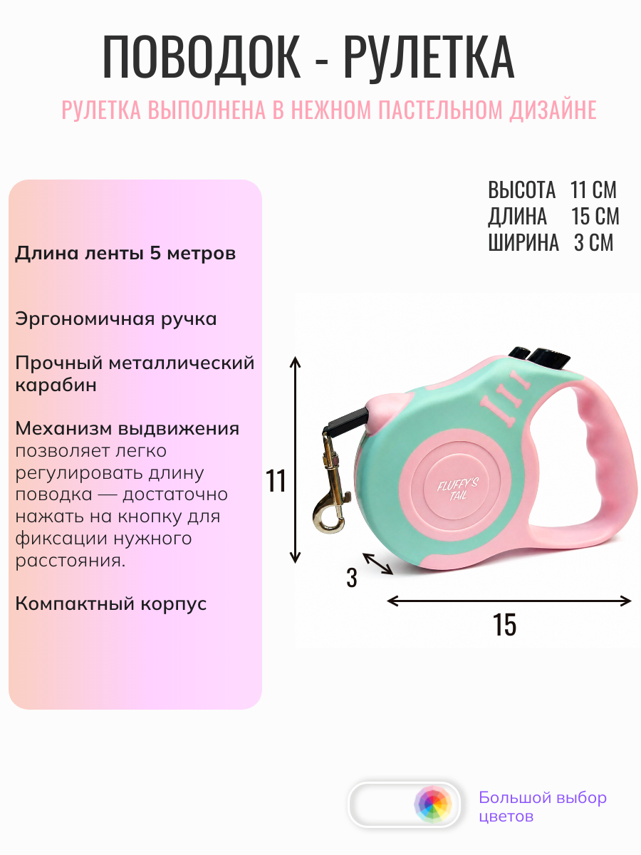 Современная рулетка-поводок идеально подходит для прогулок с питомцами средних и крупных пород. Удобна в использовании благодаря своей компактности и надежному механизму длины (до 5 метров). Изготовлено из прочных материалов, обеспечивающих безопасность и комфорт собаки. Приобретите удобную и функциональную рулетку прямо сейчас!
