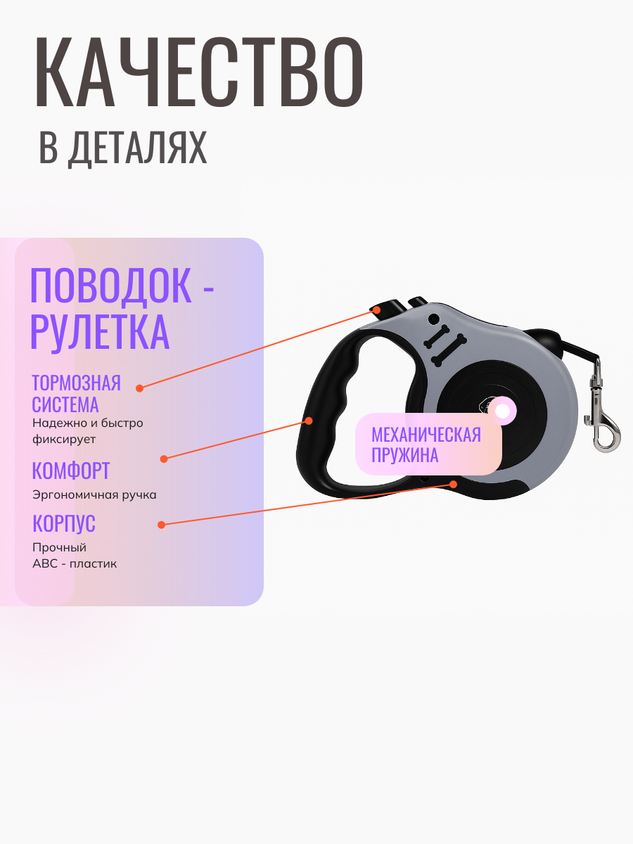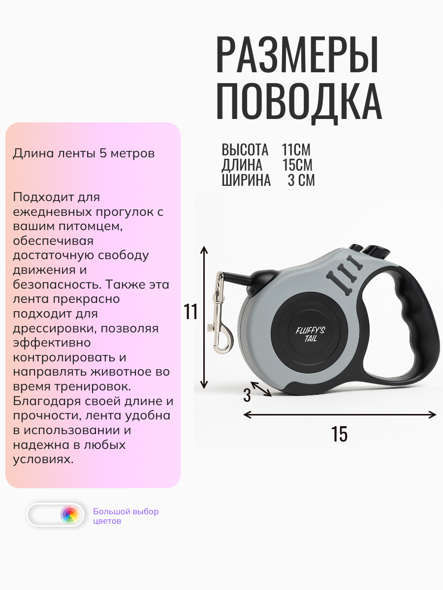 Поводок рулетка для прогулок 5 м для щенков серый